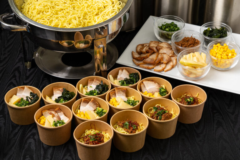 ジェイアール東日本都市開発様が大規模イベントスペースで開催した社内懇親会にて、当社のケータリングを活用いただきました。創立35周年の節目に行われる大切な会。オリジナルロゴを盛り込むなど、演出の細部にもこだわりました。