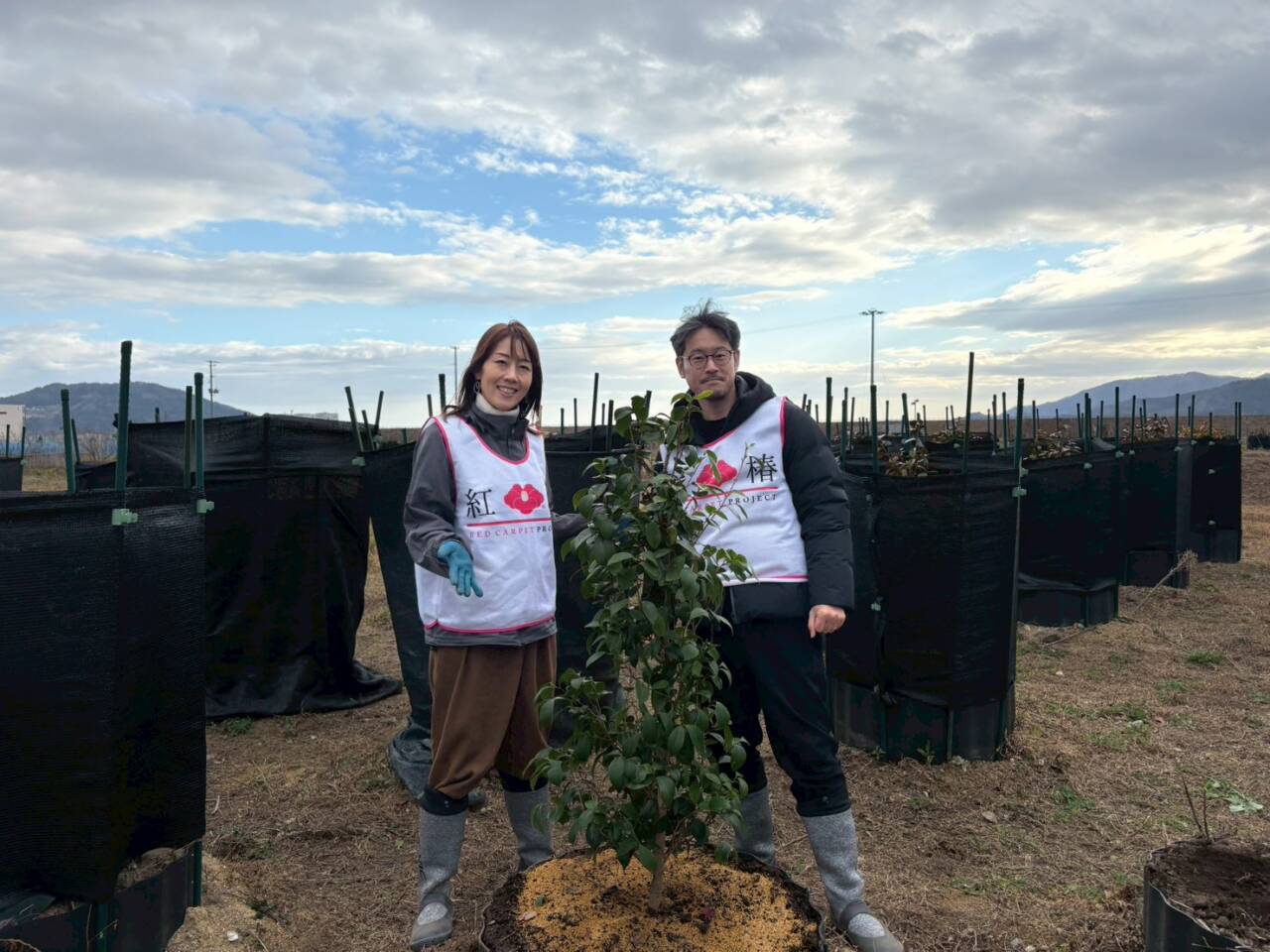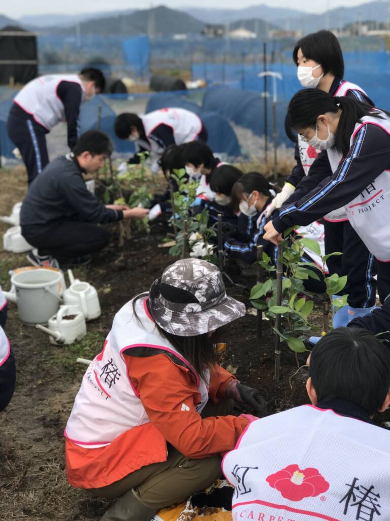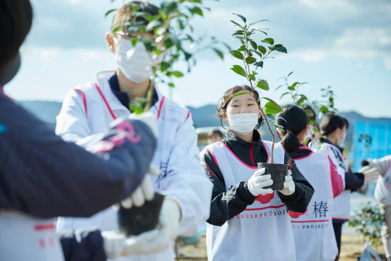 レッドカーペットプロジェクトは、震災で失われた土地に椿の苗木を植え、やがて地域一帯が“赤い絨毯”のように椿で彩られる景観を目指す活動です。