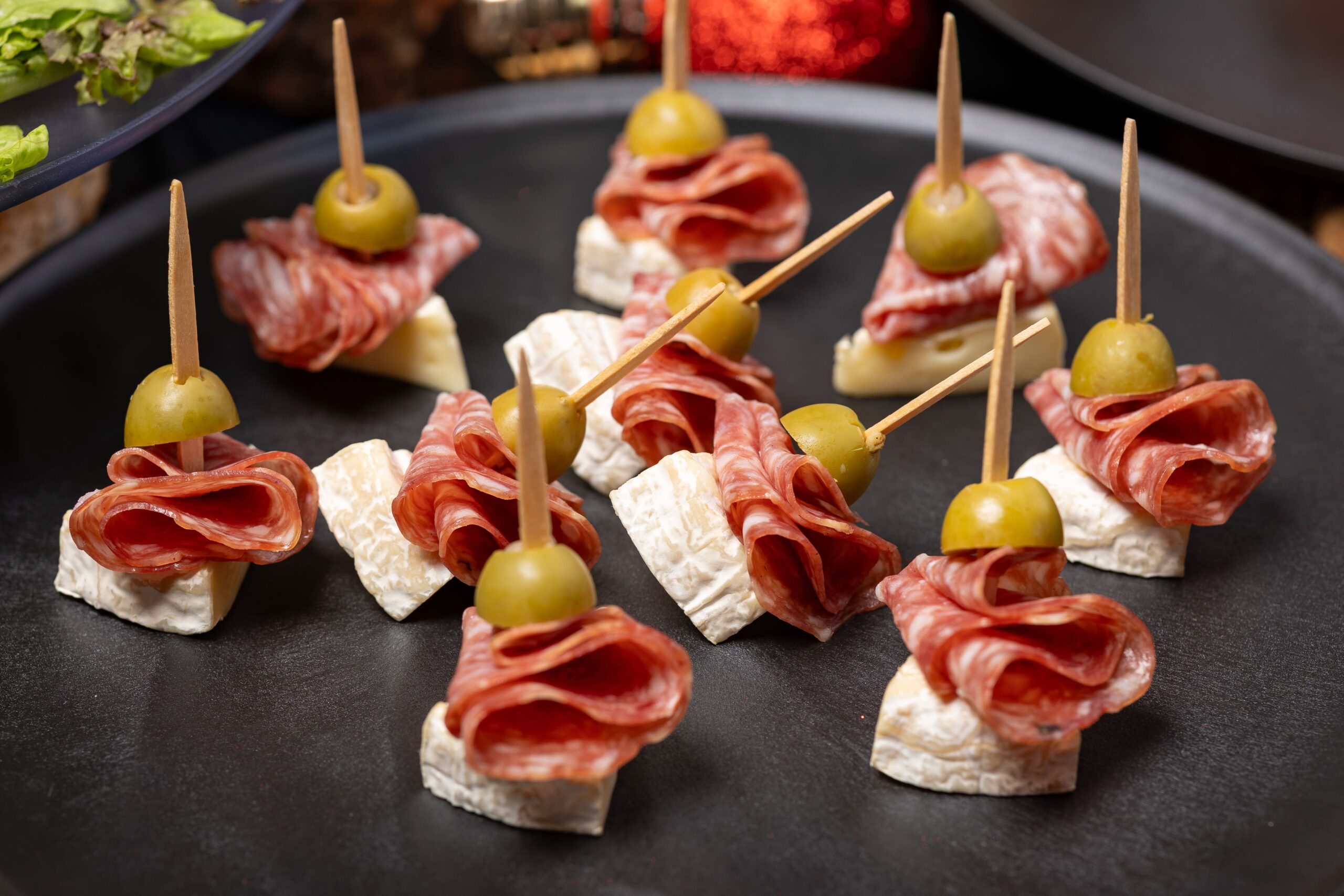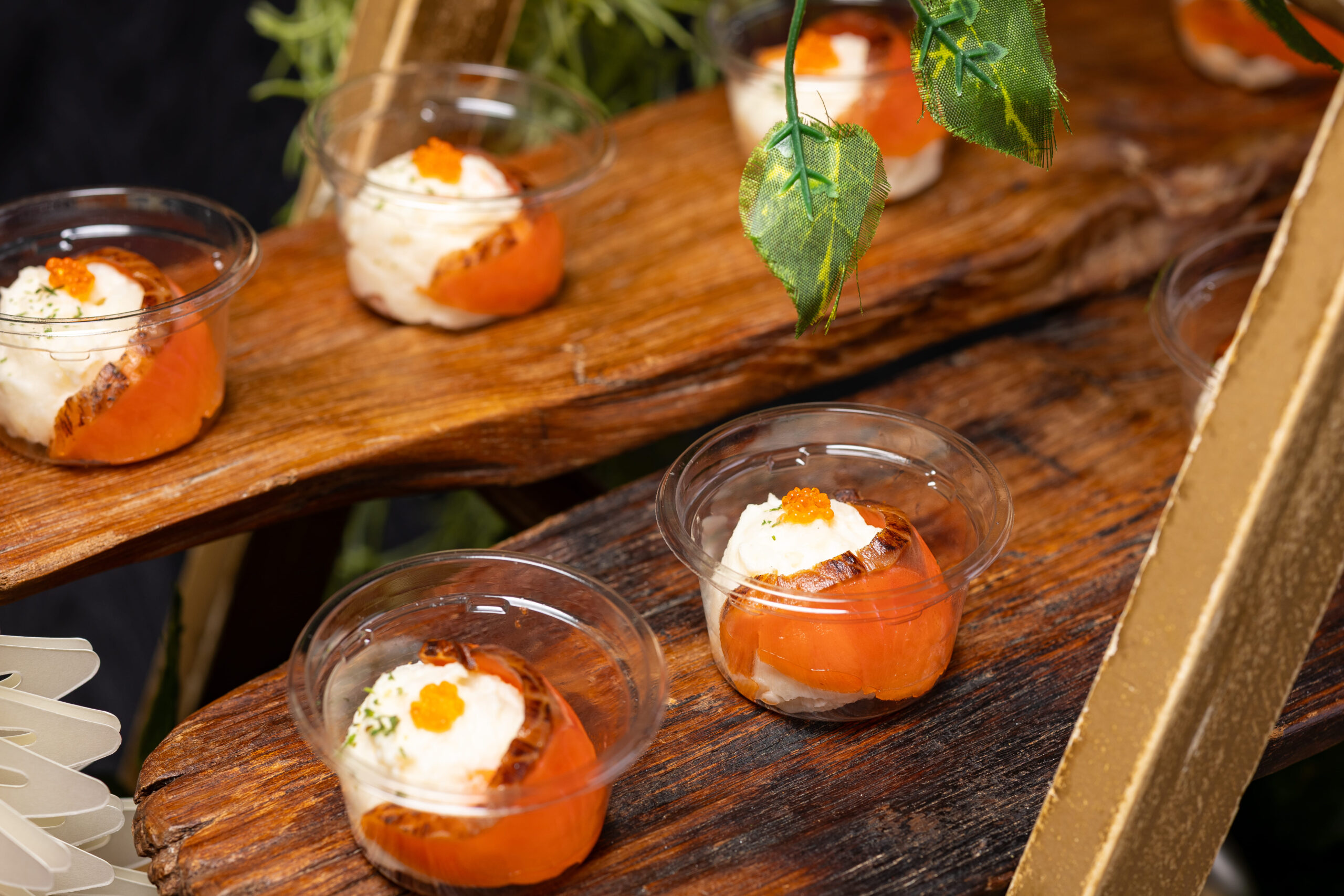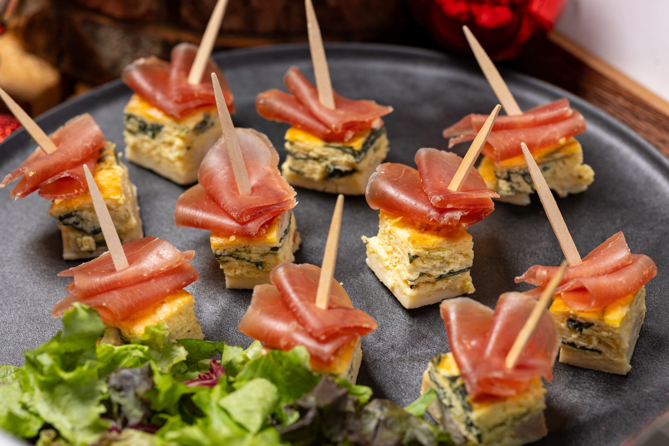 カリカリ食感がクセになるベーコンとクルトンの特製シーザーサラダ/新鮮プチトマトとモッツァレラチーズカプレーゼピンチョス/カマンベールチーズとサラミのピンチョス/フライドチキンのピンチョス/スモークサーモンとポテトサラダのハーモニーカップ/生ハムとキッシュピンチョス/特製ローストビーフ~ジンジャーソース~/(温製)濃厚トマトのクリームペンネ/(温製)ゴロゴロ海鮮のクラムチャウダー/季節のロールケーキ