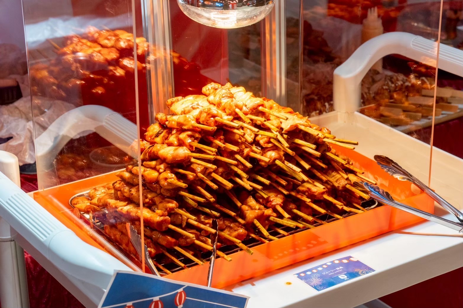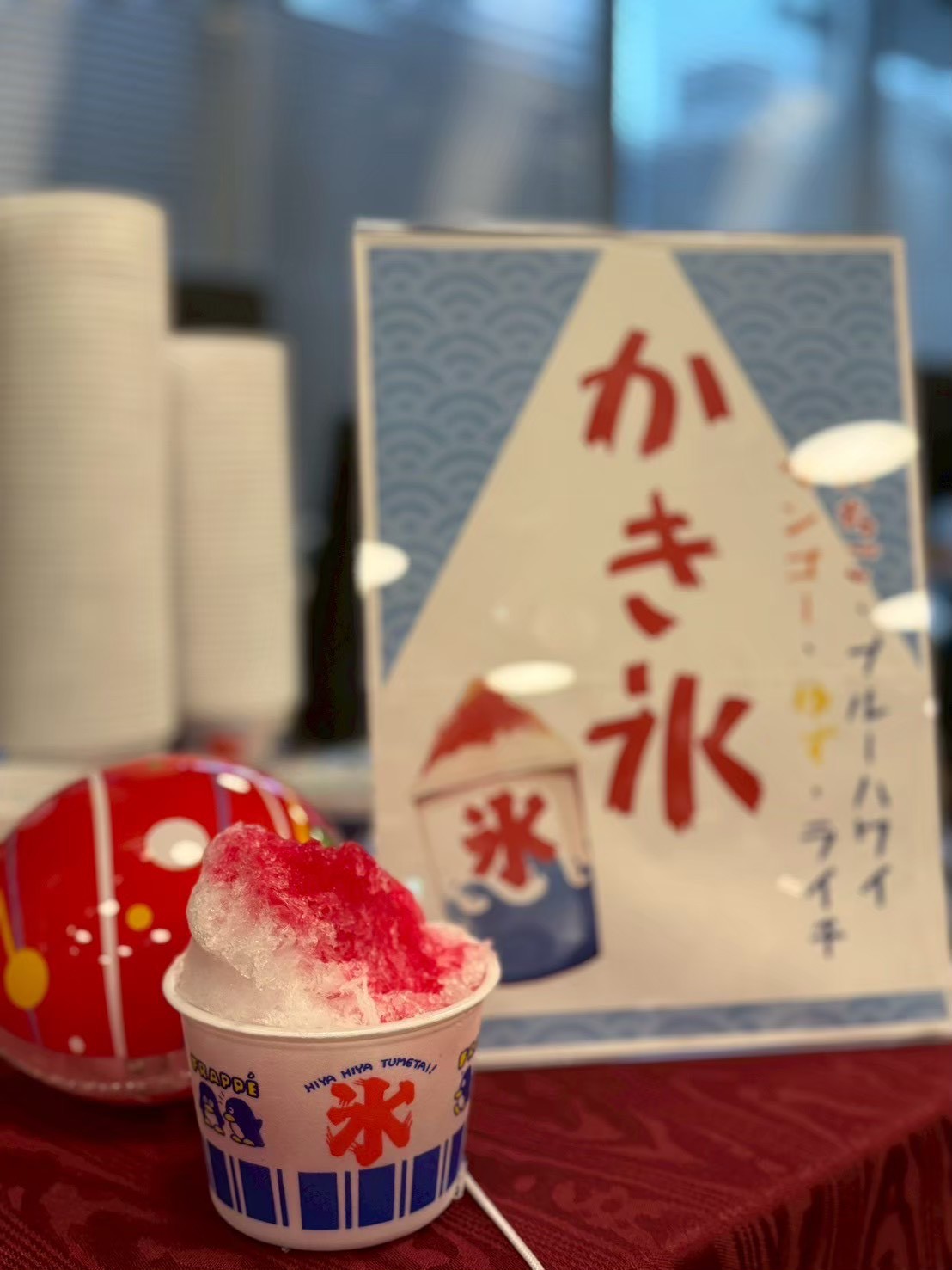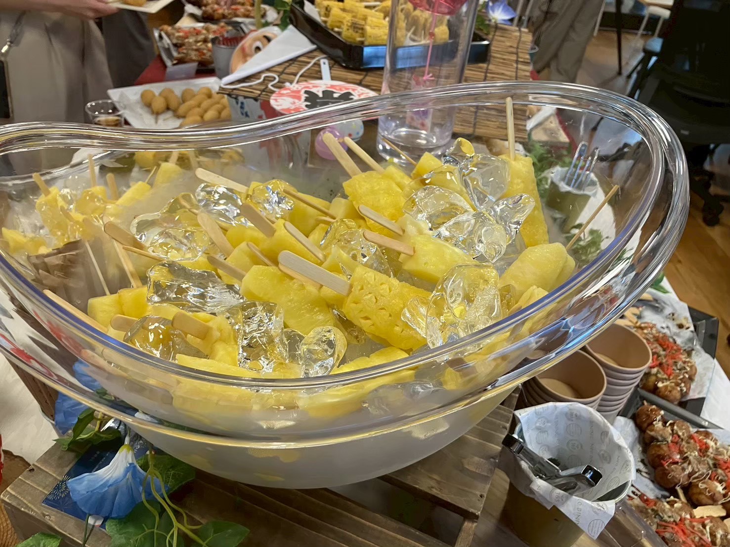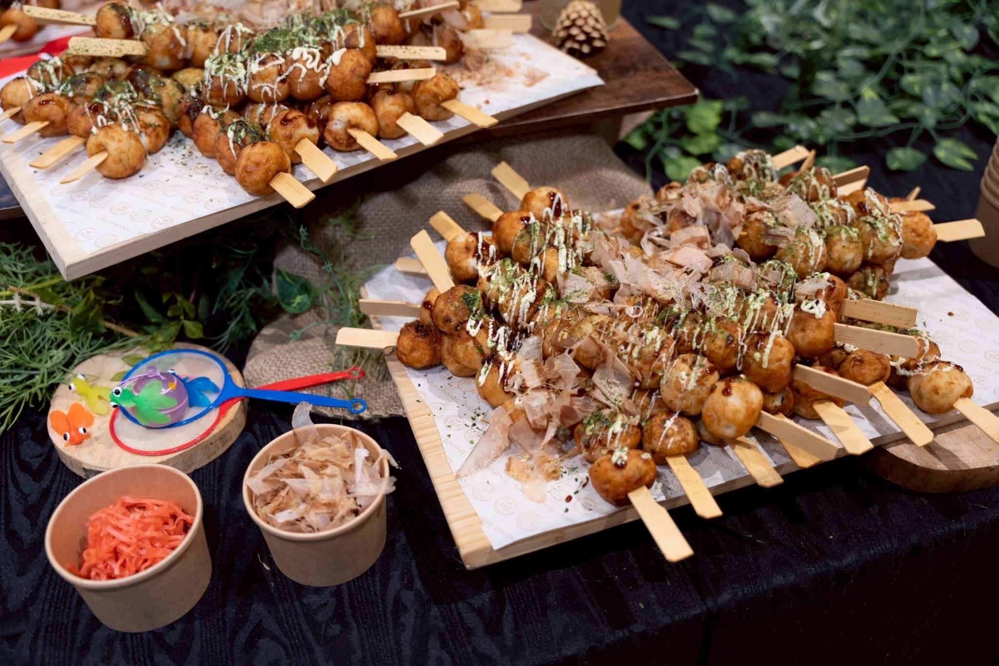提供されるメニューは、焼きそば、たこ焼き、お好み焼き、チョコバナナといった「縁日屋台の定番」が中心。NEO DINING.では、かき氷機を持ち込んでその場で出来たてを提供したり、ドリンクを氷水の入った桶にドブ漬けして冷やしたりと、お祭り特有のライブ感を大切にしています。