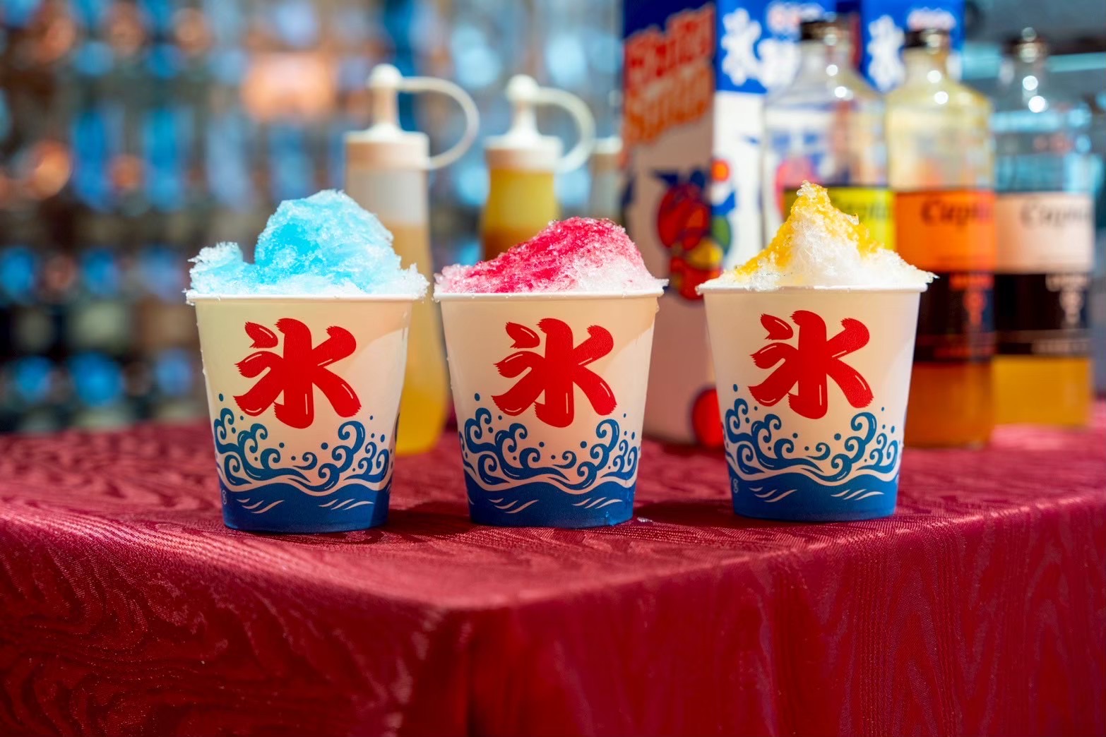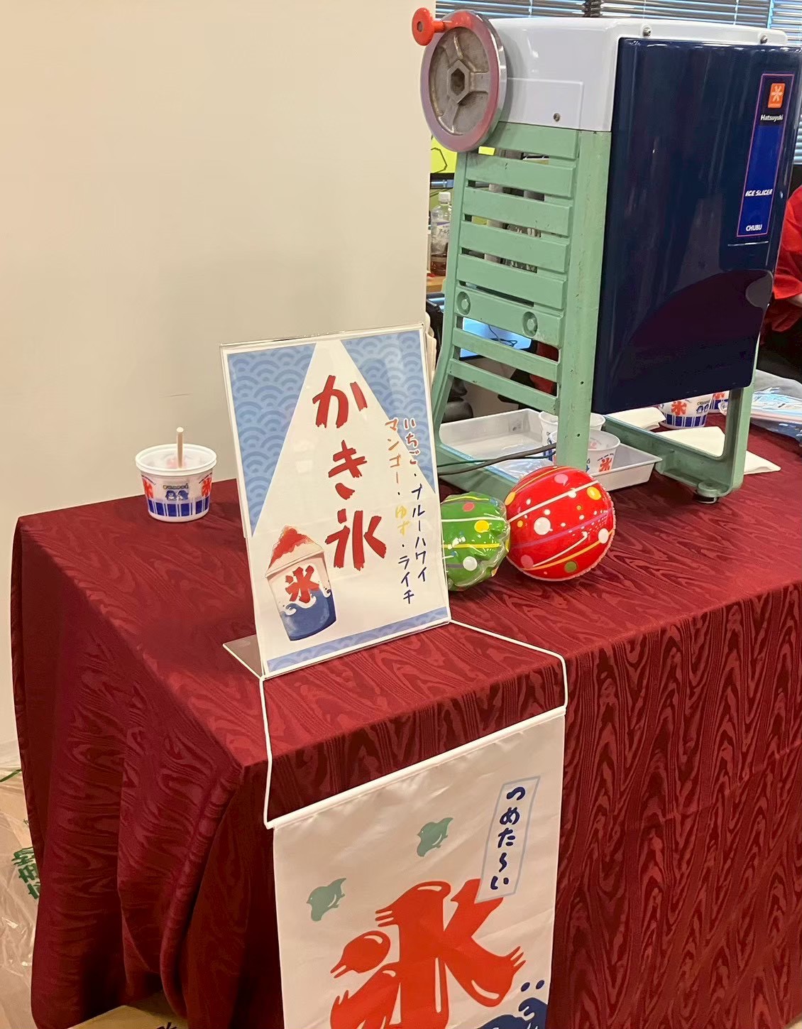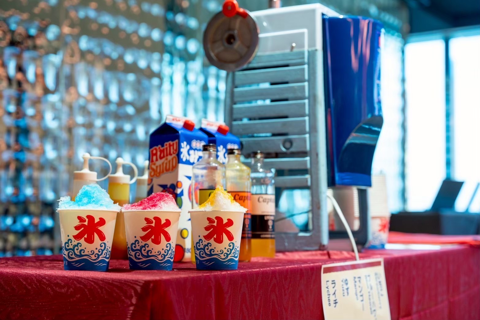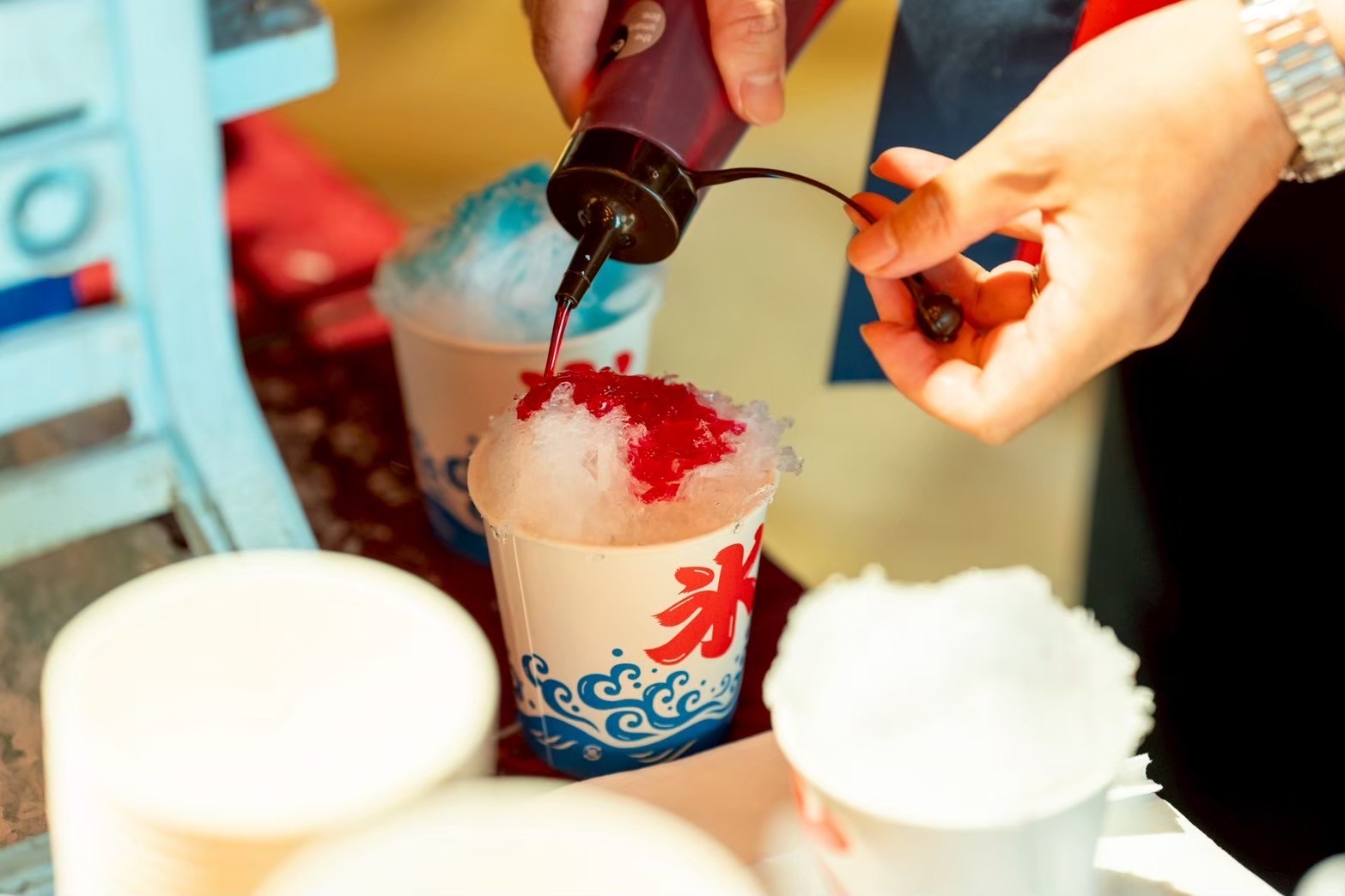 その場で作るライブかき氷は夏祭りケータリングの定番。様々なシロップをかけて召し上がれ♪