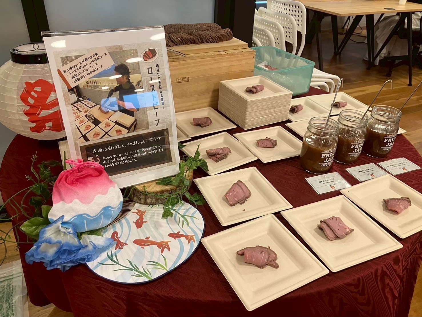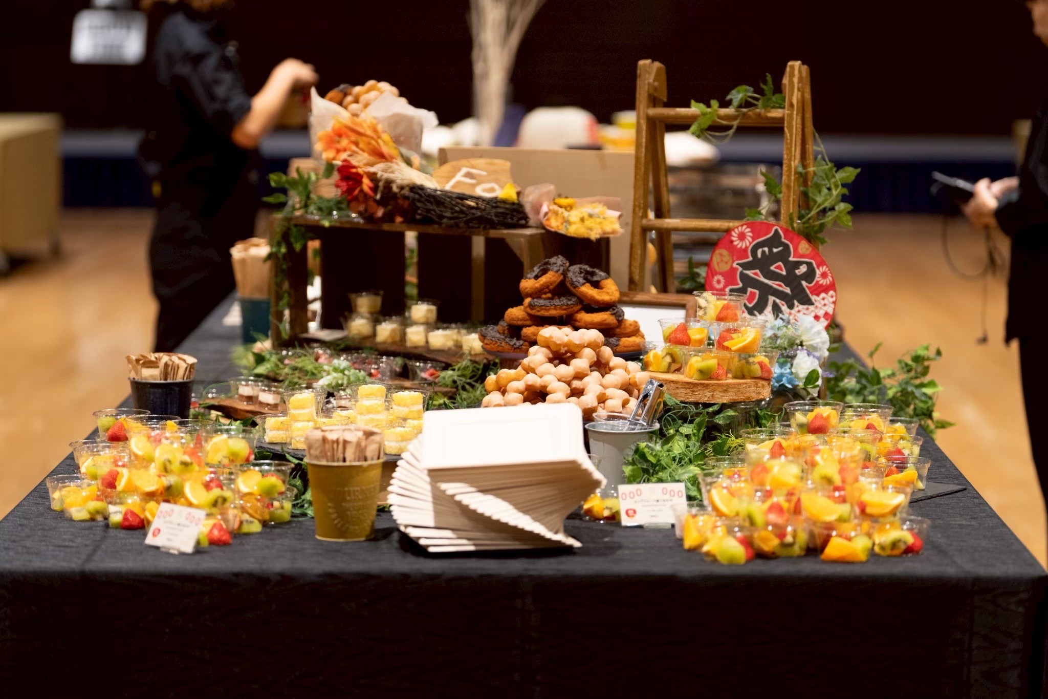 基本的に本番開始の1.5時間前に準備スタート。フードに華やかな無料装飾を施し、会議室を「出張レストラン」に変身させます。