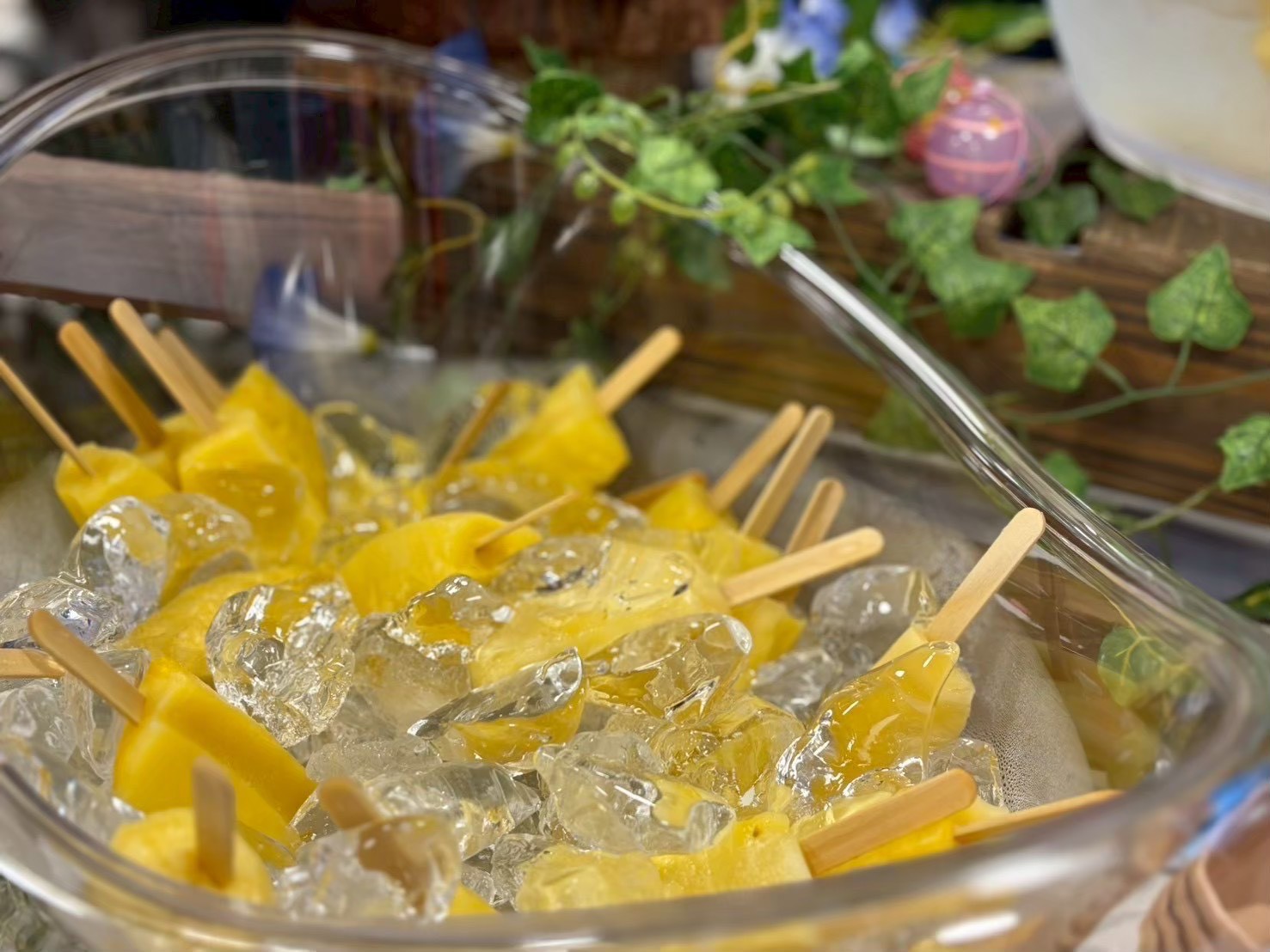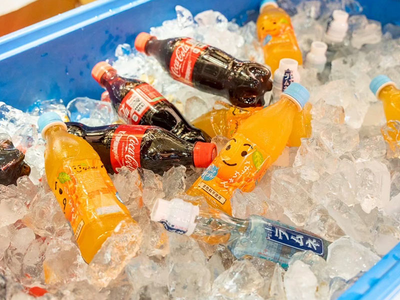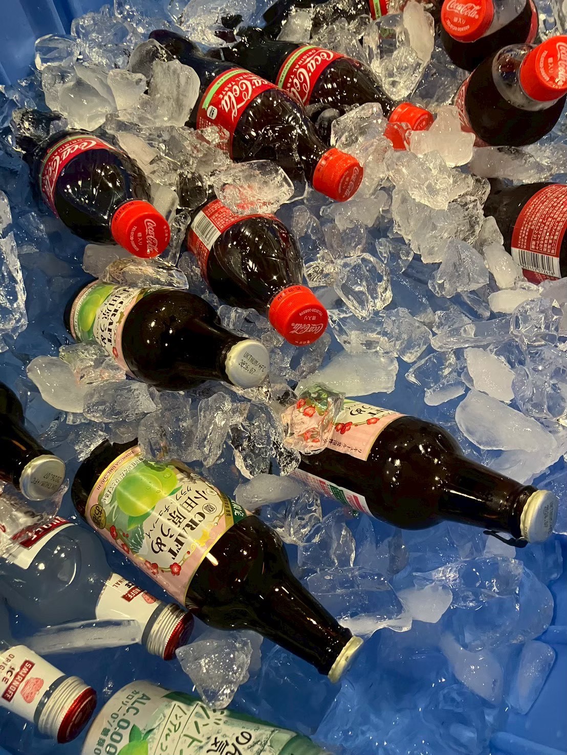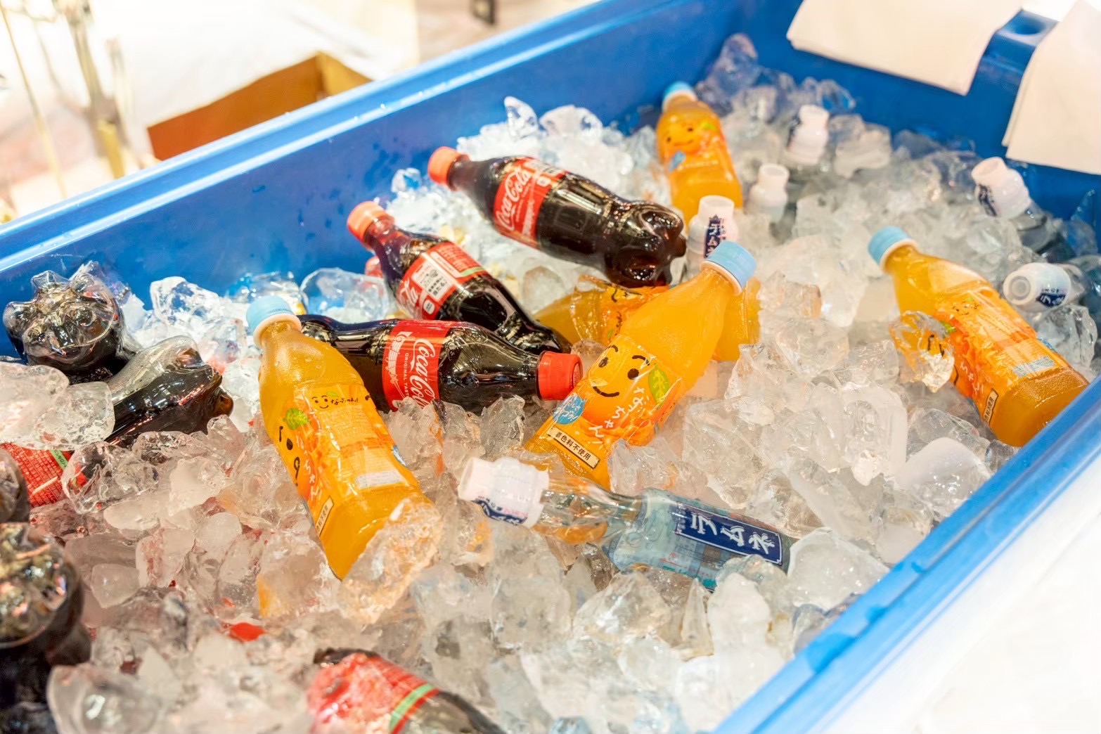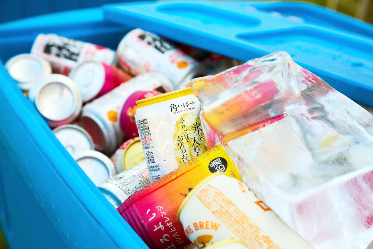 当社の夏祭りケータリングのドリンクは、”氷どぶ漬けスタイル”での提供が人気です。氷水でビールや缶チューハイ、ジュースなどをキンキンに冷やしてご提供します。